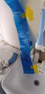 水抜きが終わってから、次回の調査までの対策として写真のような水路を作りました。雨が降らなければいいのですが、降った時のために洗面台に流れるようにしてあります。