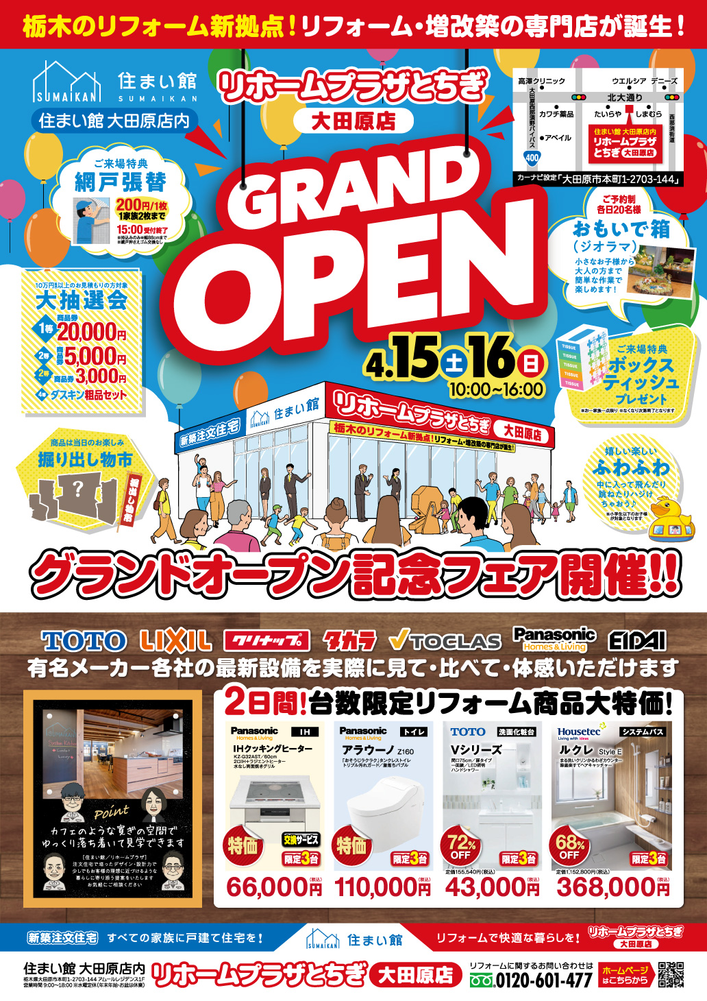 リホームプラザとちぎ大田原店グランドオープンに伴い、4月15日と16日の2日間オープン記念フェアを開催いたします。