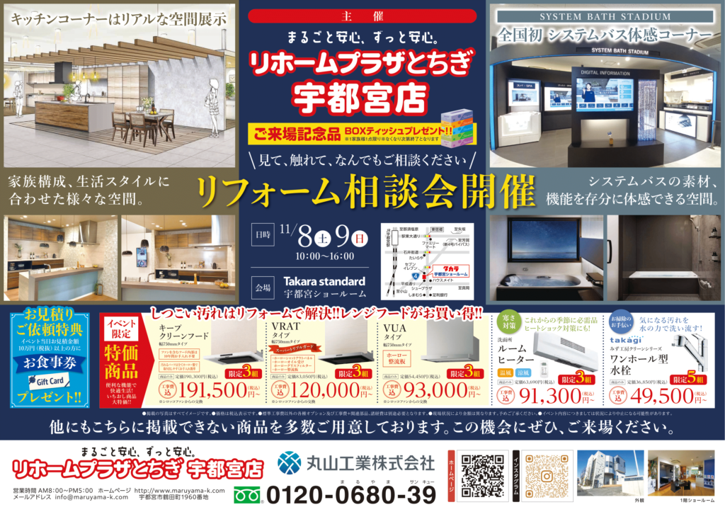 - 11月8日(土)10時~16時 9日(日)10時~16時 (会場:タカラスタンダード宇都宮ショールーム) 詳しくはこちら >
