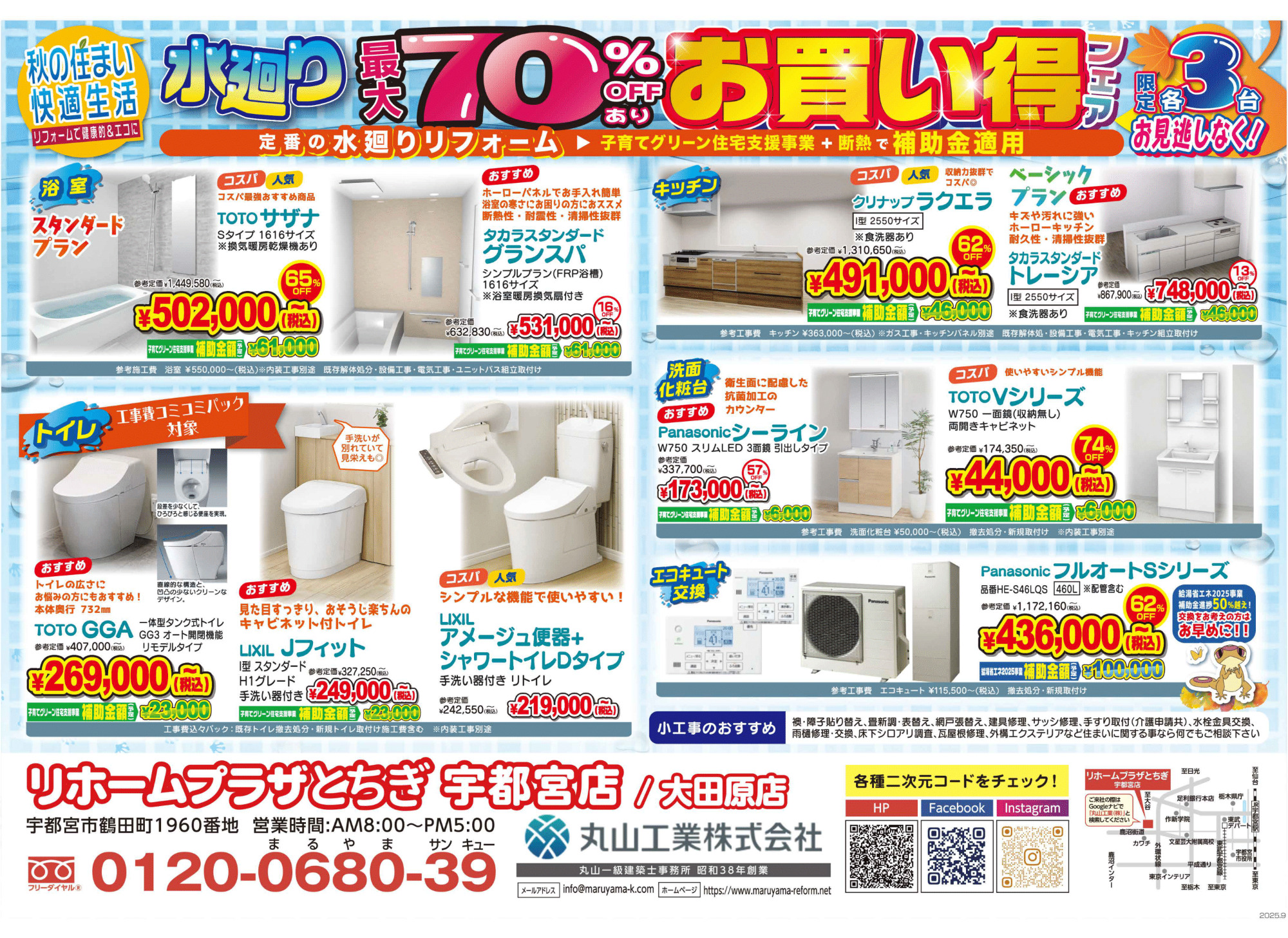 また弊社のショールームにも一部チラシに掲載している水廻り商品の展示がございますので、商品を見ながらのお打ち合わせも出来ます!