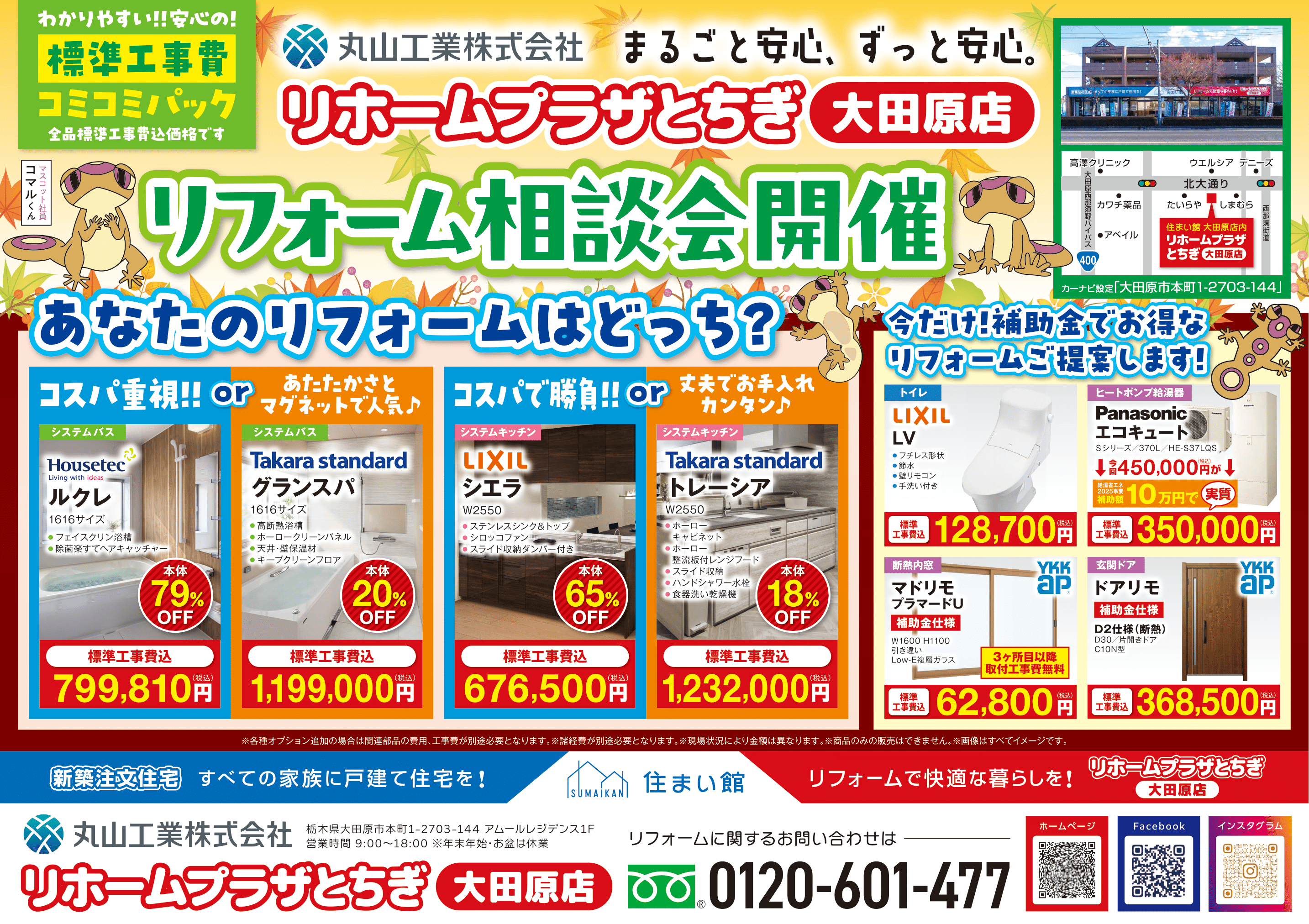 今回の大田原店のチラシでは、ユニットバスやキッチンで、お客様が重視する事を選んでいただいたり、住宅省エネキャンペーンの補助対象商品のエコキュート、冬に向けた内窓やおすすめリフォームを標準工事費コミコミパックでご紹介しています。
