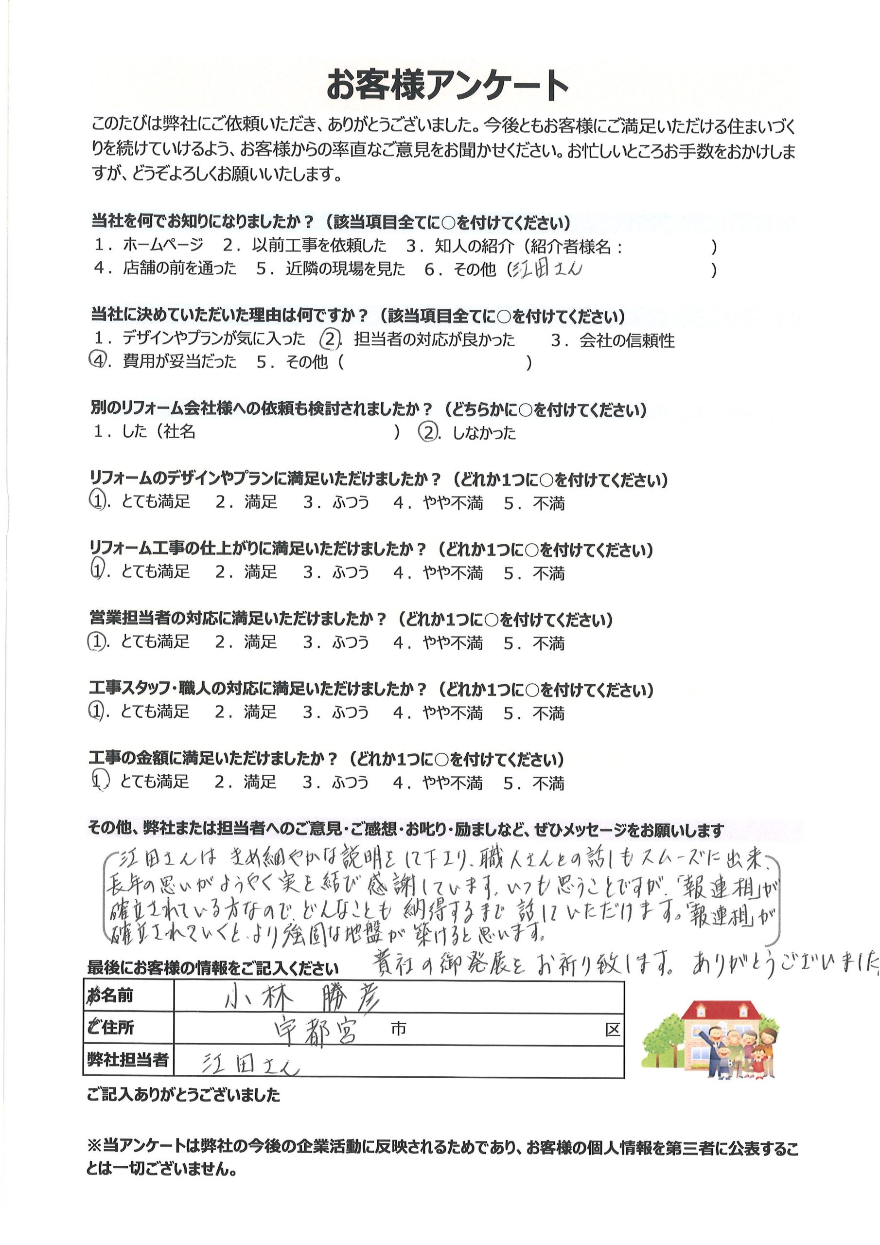江田さんはきめ細やかな説明をして下さり、職人さんとの話もスムーズに出来、長年の思いがようやく実を結び感謝しています。