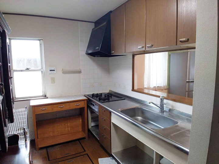 提案として普段手の届かない吊戸棚は撤去して、対面の開口部を広げて開放的な空間にしました。撤去した吊戸棚の収納スペースは新設したカップボード(食器棚)にて補いました。